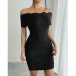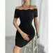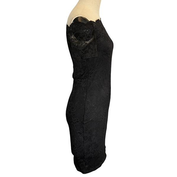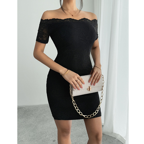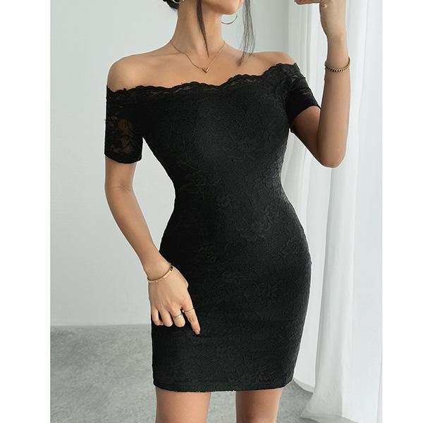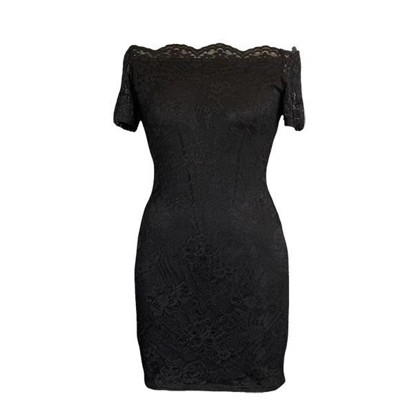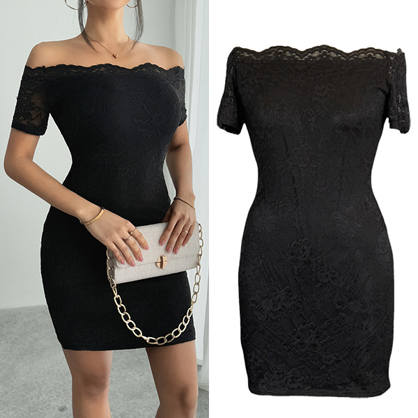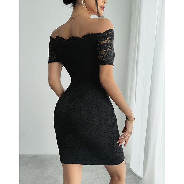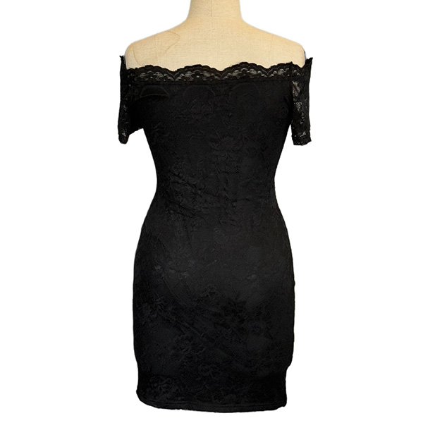 Embrace timeless elegance with this black lace dress! Featuring delicate lace detailing, off-the shoulder details and short sleeve design, this dress is perfect for special occasions, weddings, or evening events.