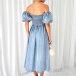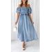 Elegant Old-wash Smocked Bodice Puff Short Sleeve Off-the-shoulder Denim Dress