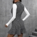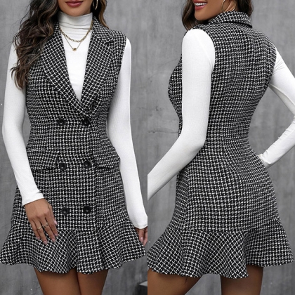 Elegant Plaid Notch Lapel Double-breasted Sleeveless Ruffle Hemline Suit Dress