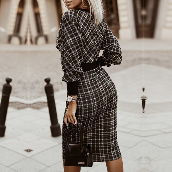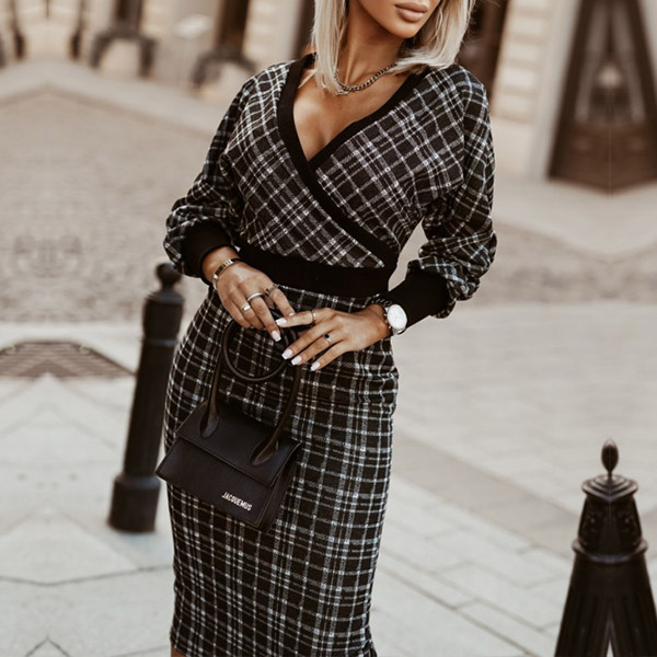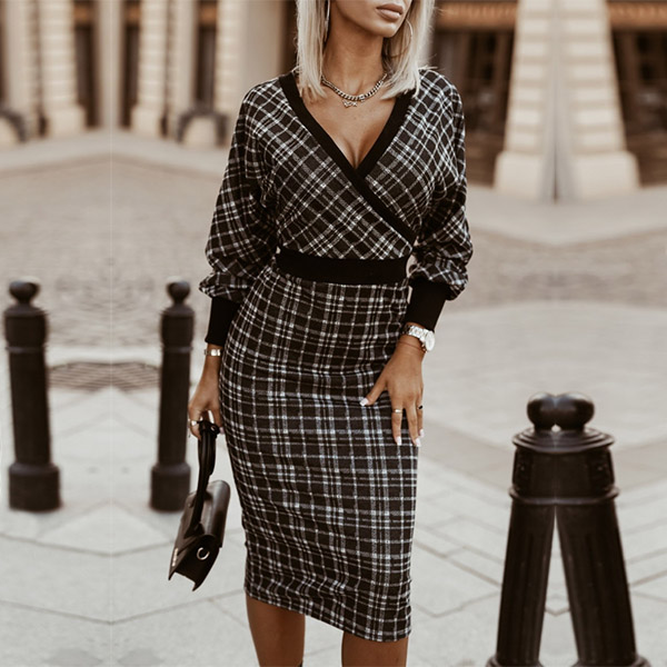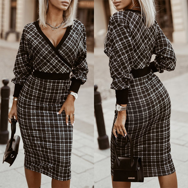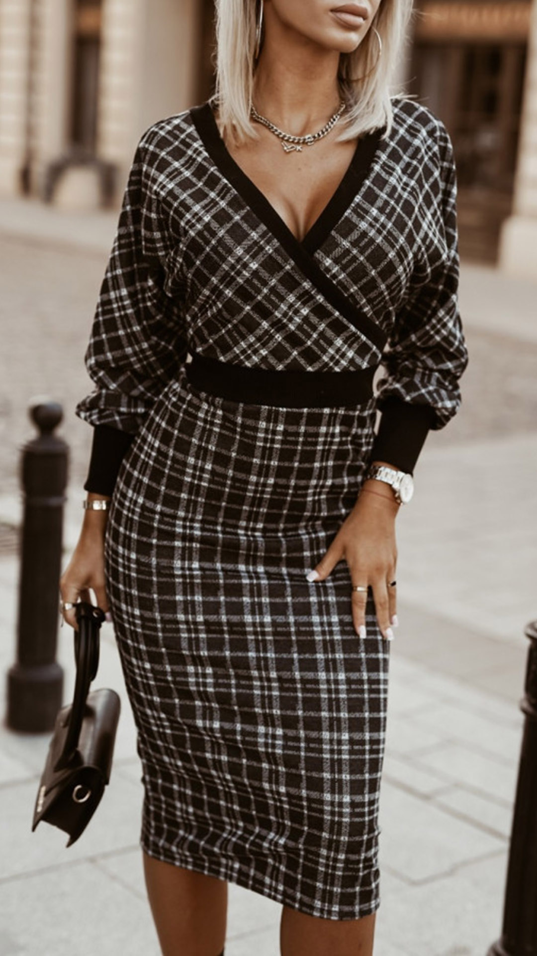 Elegant Plaid V-neck Long Sleeve Bodycon Dress