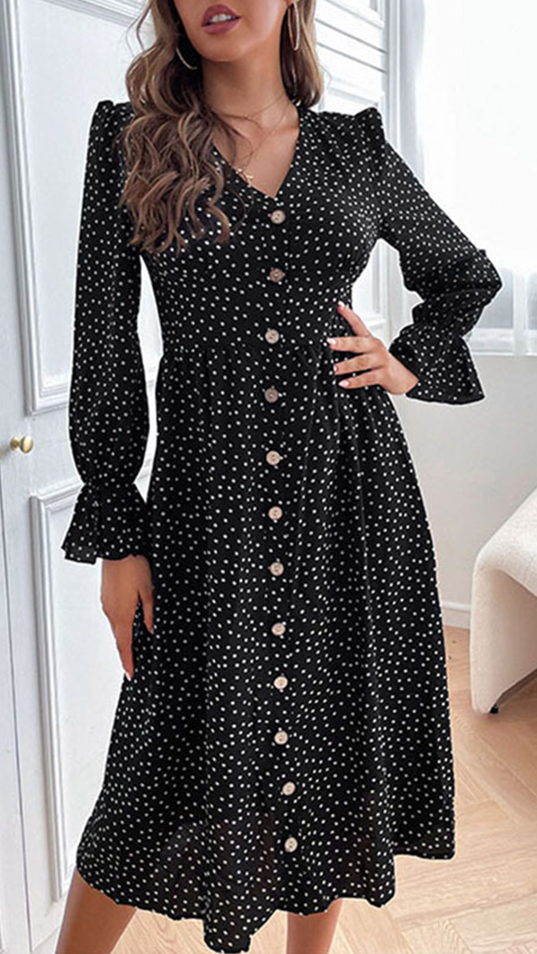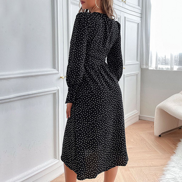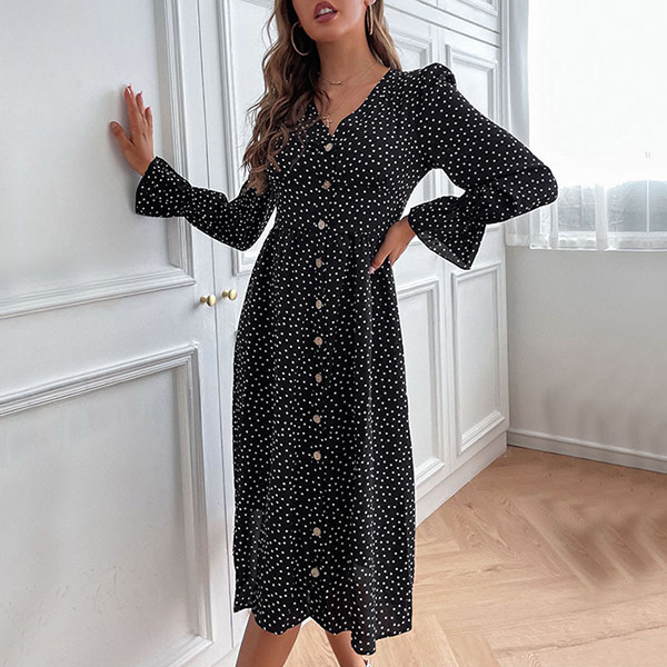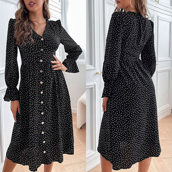Elegant Polka-dot Printed V-neck Buttoned Long Sleeve Dress
