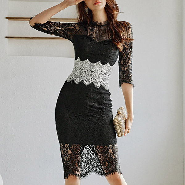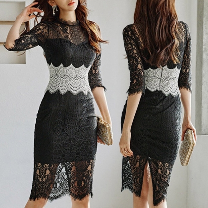Elegant Round Neck Elbow Sleeve Slit Lace Bodycon Dress