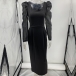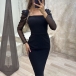 Elegant Semi-through Gauze Spliced Long Sleeve Square Neck Bodycon Maxi Dress