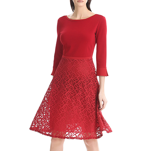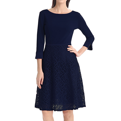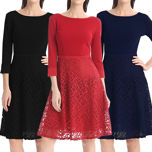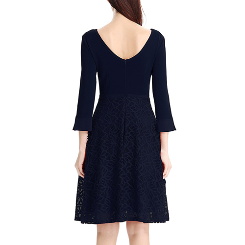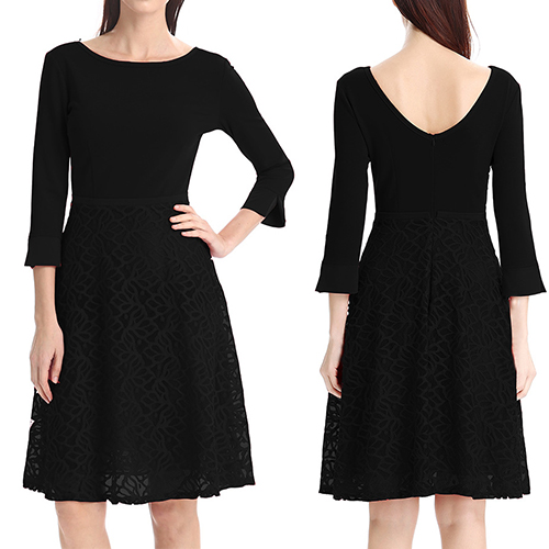 You can keep looking elegant from daytine to night in this dress. Solid color style,styled with 3/4 sleeve,round neck and lace