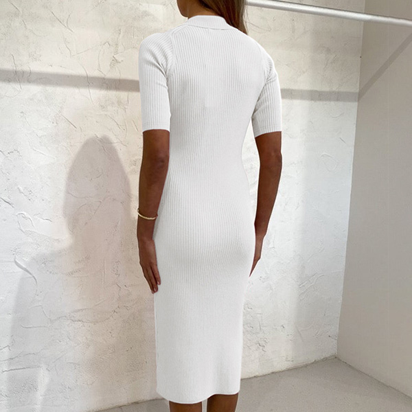 Elegant Solid Color Buttoned Stand Collar Short Sleeve Ribbed Bodycon Dress