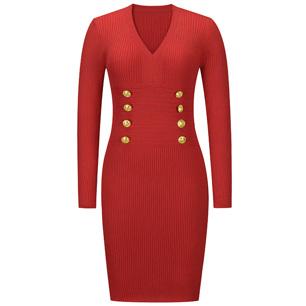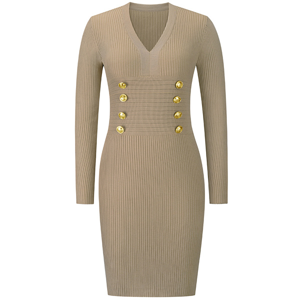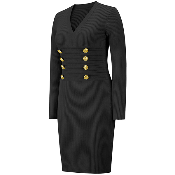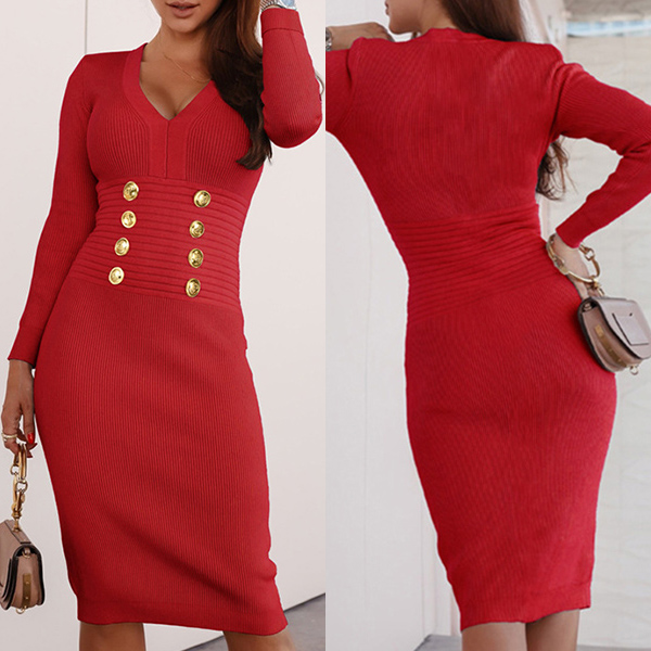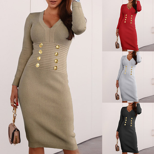 Elegant Solid Color Double-breasted V-neck Long Sleeve Bodycon Knitted Dress