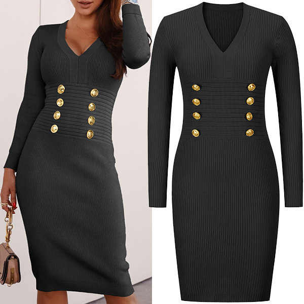 A new basic dress! This dress features a double-breasted design with V-neckline, long sleeves, and a bodycon silhouette. The dress is made from a soft and comfortable knit fabric and is available in a variety of colors.