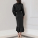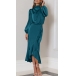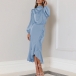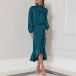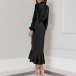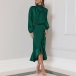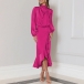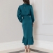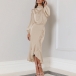 Elegant Solid Color Draped Neck Long Sleeve Ruffled Irregular Hemline Satin Dress