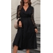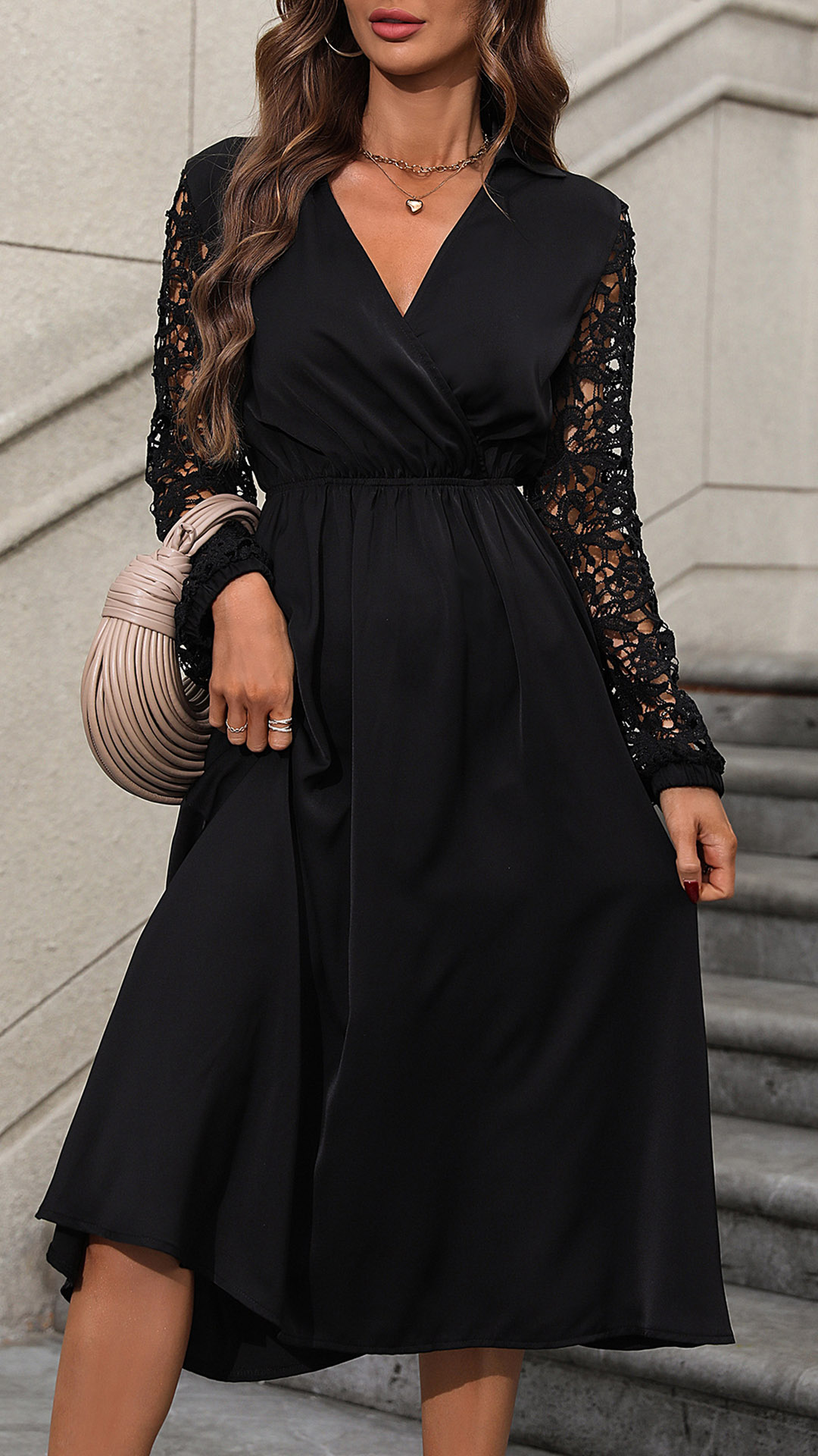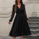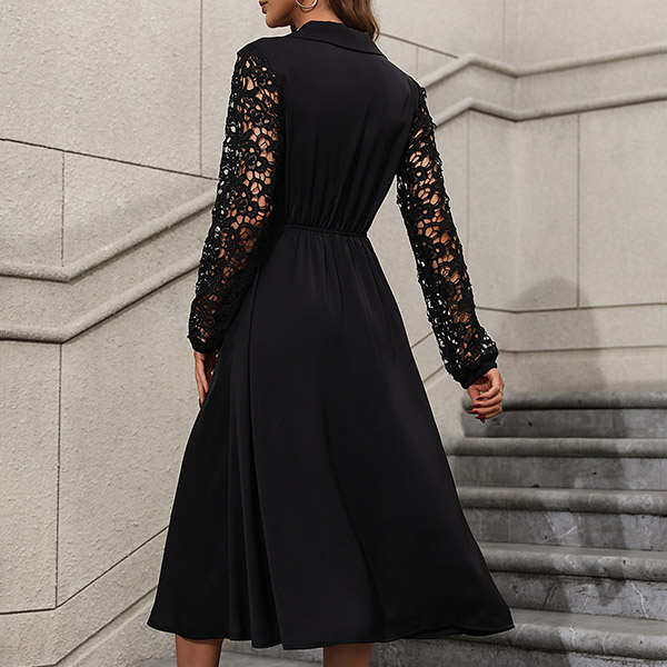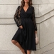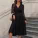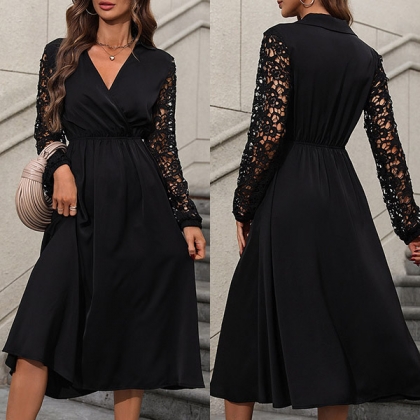 Elegant Solid Color Lace Spliced Long Sleeve V-neck High-rise Black Dress