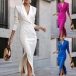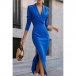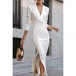 Elegant Solid Color Lapel V-neck Long Sleeve High-rise Side Slit Maxi Dress