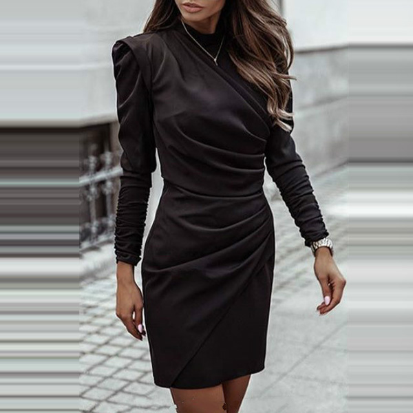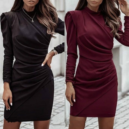 Elegant Solid Color Long Sleeve Mock Neck Slim Fit Wrinkled Dress