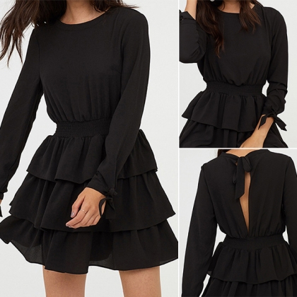 Elegant Solid Color Long Sleeve Round Neck Cake Hem Dress