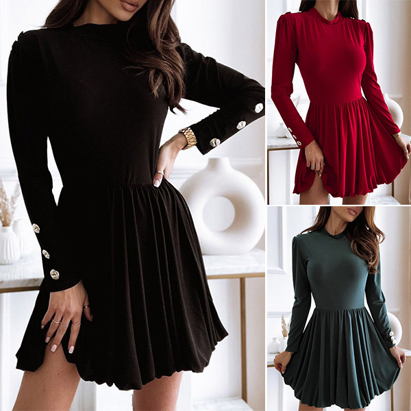 Elegant Solid Color Long Sleeve Round Neck Pleated Hem Dress