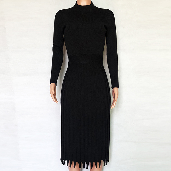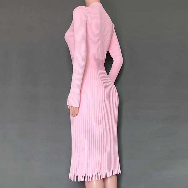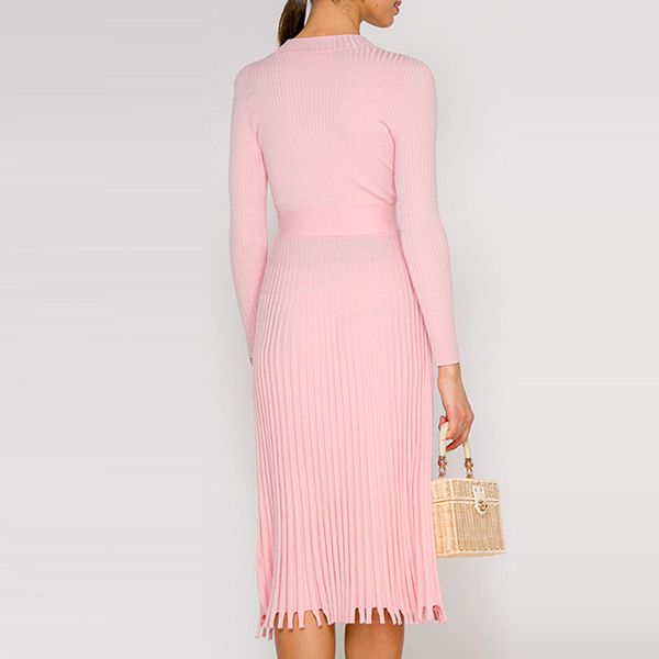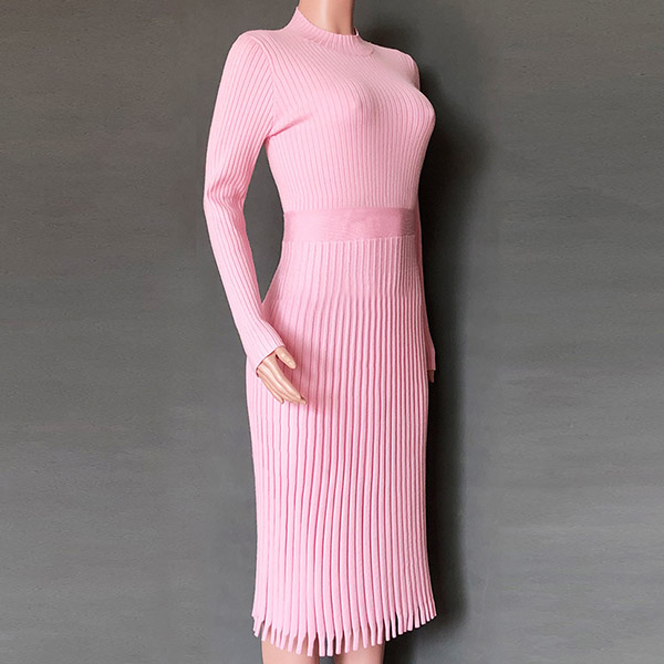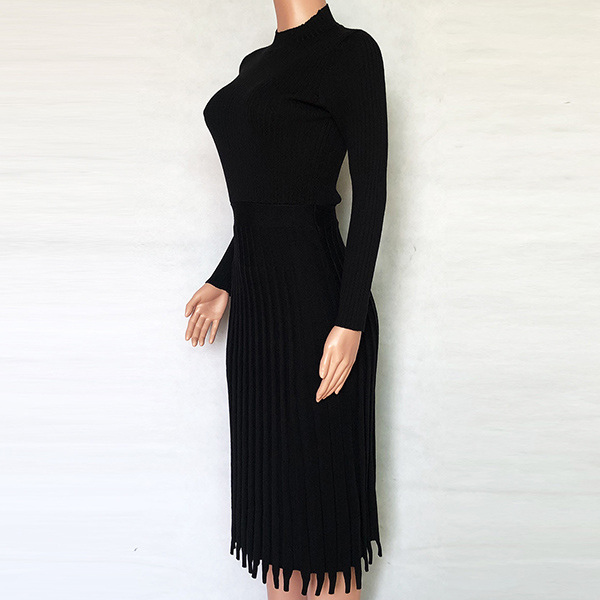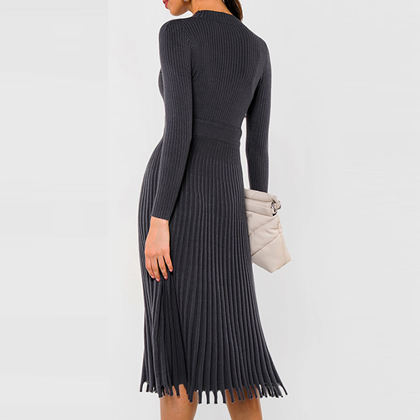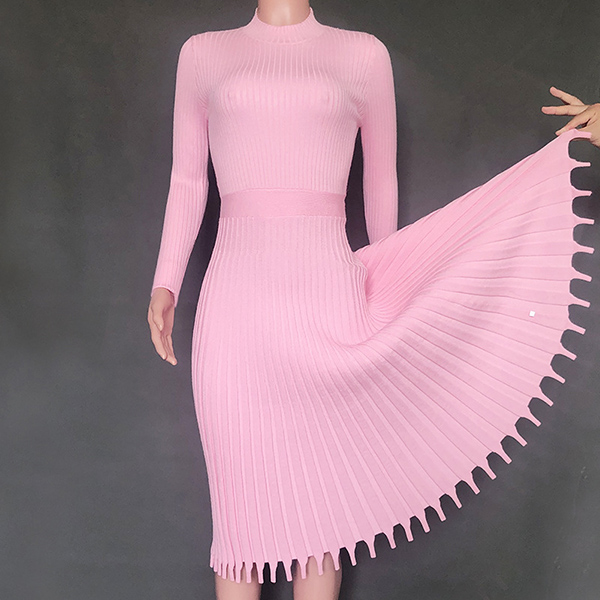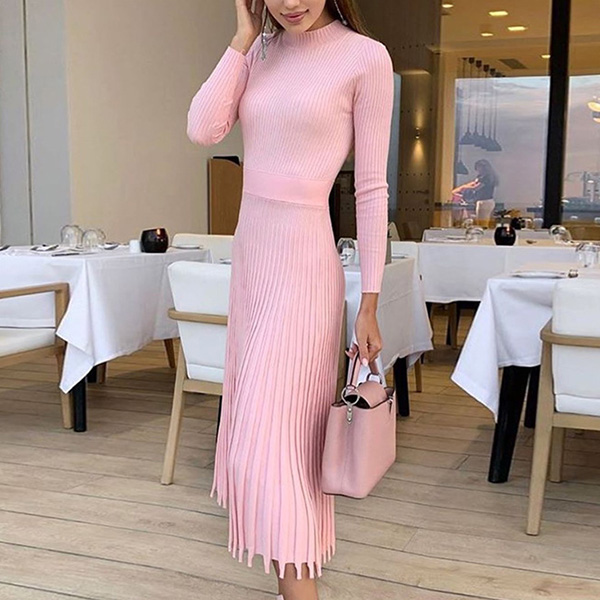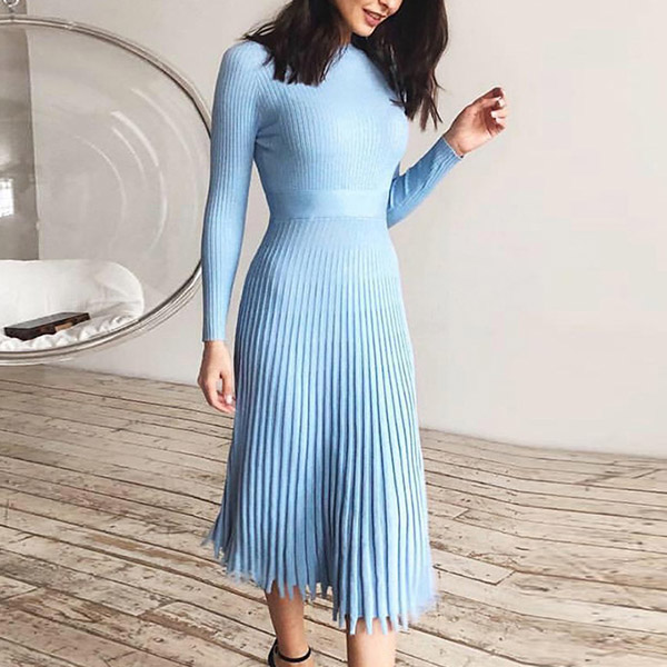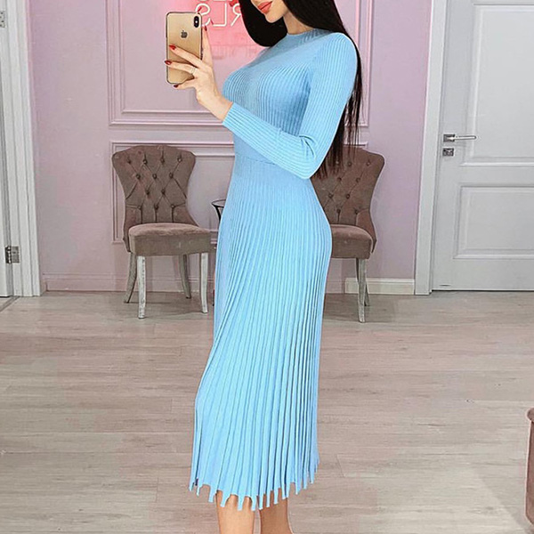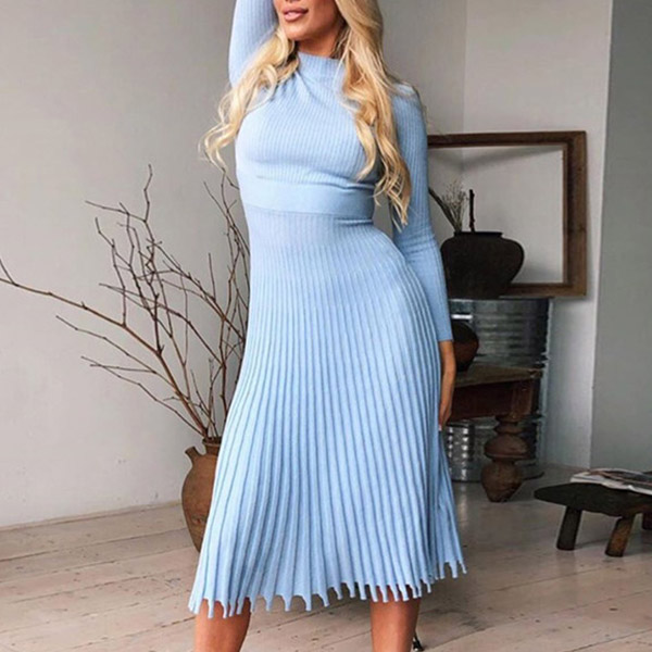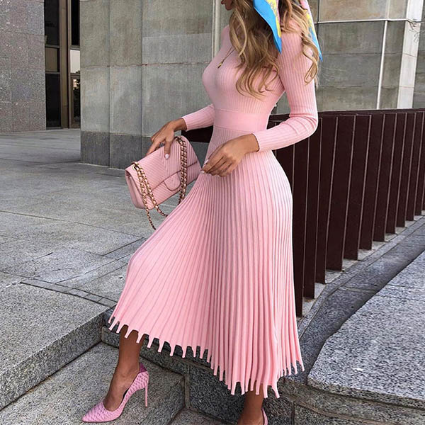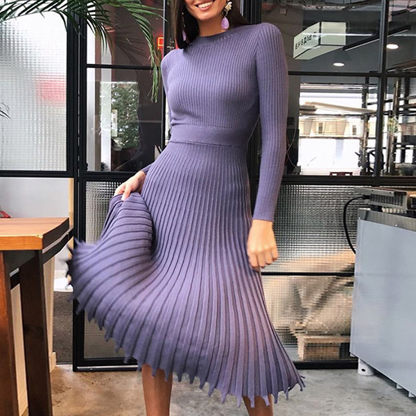 Elegant Solid Color Long Sleeve Round Neck Pleated Hem Knit Midi Dress