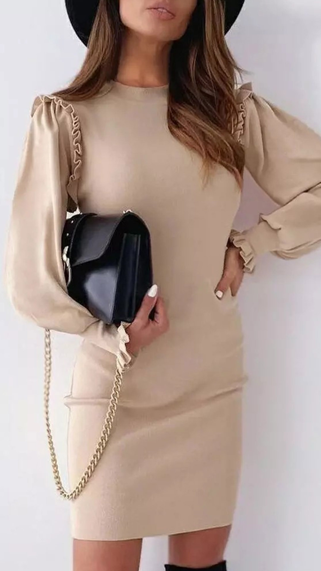 It is an easy thing to portray your elegant,delicate and charming image through this dress. It comes with a solid color,finished with long sleeve,round neck and a fit silhouette,this dress can showcase your slender figure. Moreover,the ruffle design at the shoulder part will lend you some sweet and stylish vibes. This is a dress which can be fit for different occasions. So why not buy one?