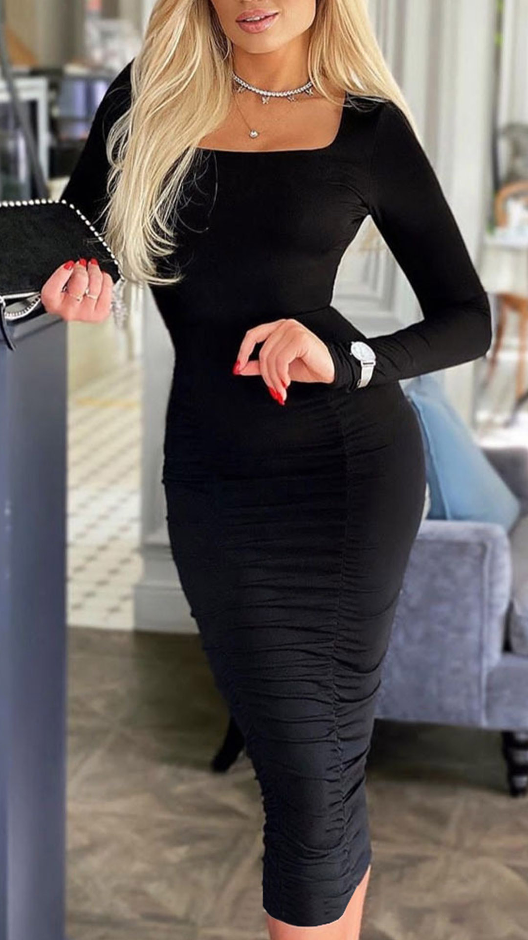 Wanna portray your elegant and charming image through this dress. The flattering black tone and fit silhouette design can better showcase your slender figure,while the square collar design will enhance your feminine appeal. You can trust in this piece to express your beauty and charm.