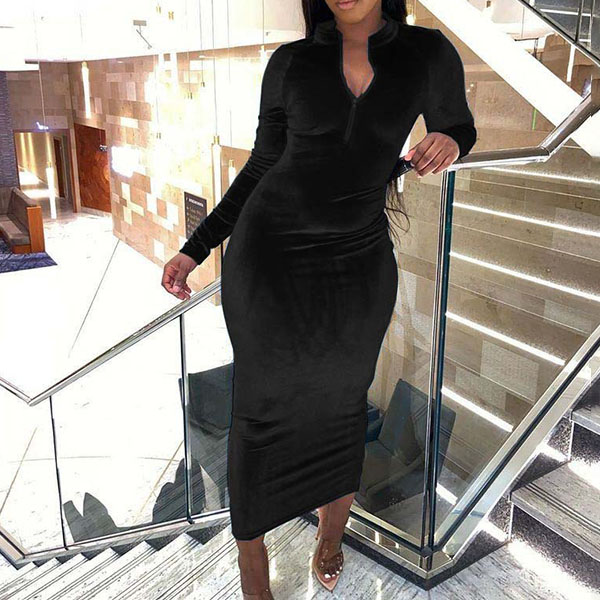 Elegant Solid Color Long Sleeve Stand Collar Slim Fit Dress