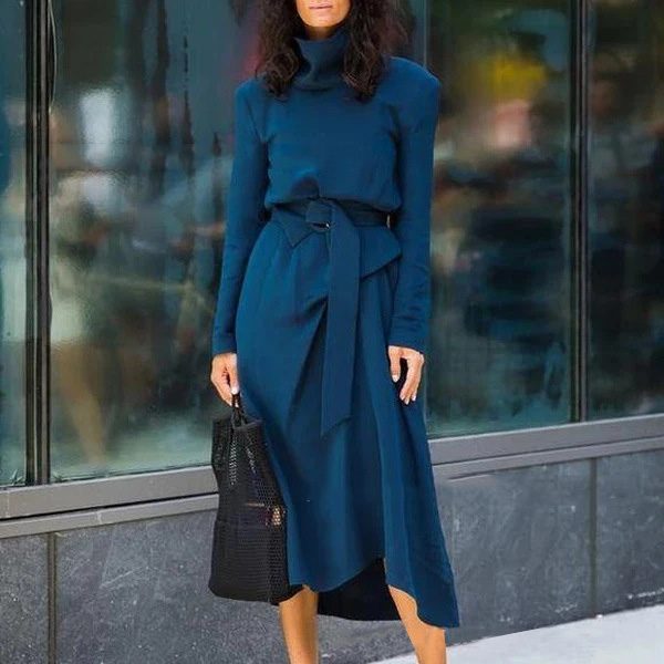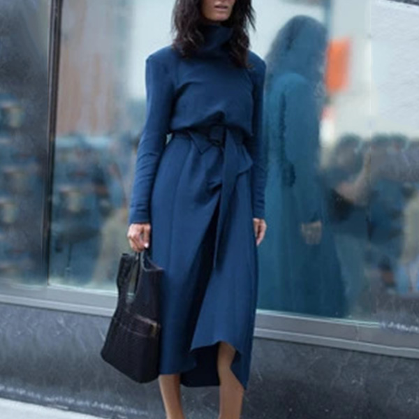 Elegant Solid Color Long Sleeve Turtleneck Dress with Waist Strap