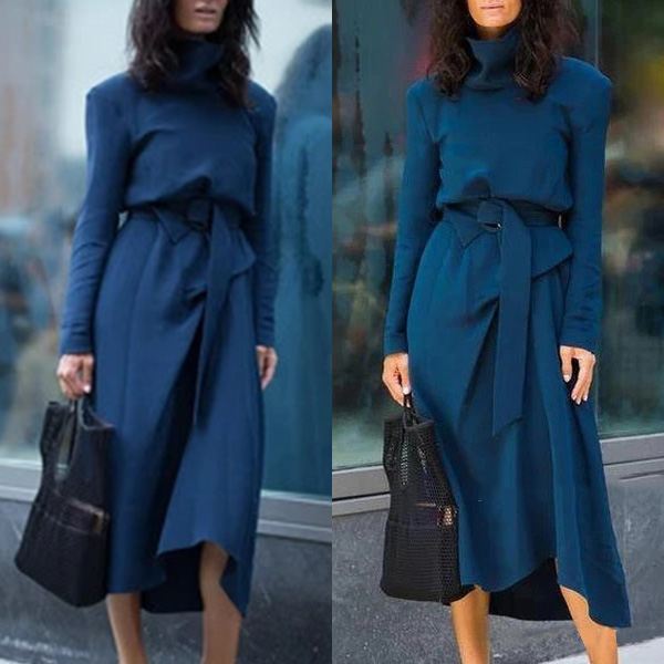 You can easily portray your elegant and charming image through this delicate dress. It comes with a solid color,finished with long sleeve and turtleneck design,this dress is perfect fit for these spring and autumn days. Moreover,the waist strap design not only can help showcase your slender figure,but also boosts its entire charm. So why not buy one?