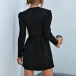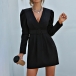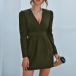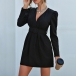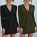 Elegant Solid Color Long Sleeve V-neck High Waist Dress