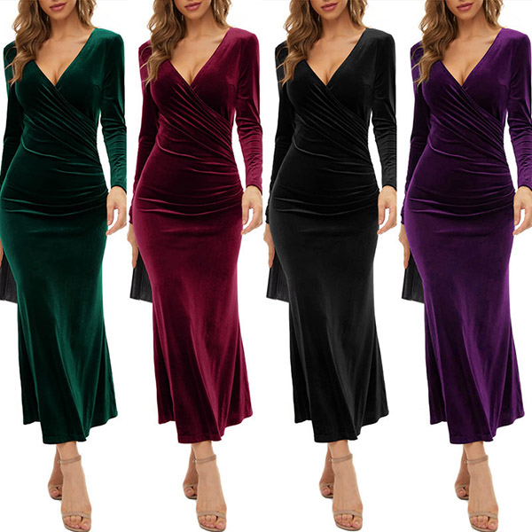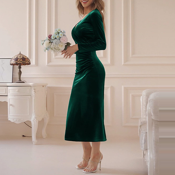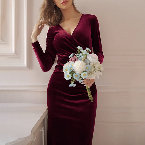 Elegant Solid Color Long Sleeve V-neck Slim Fit Velvet Party Dress