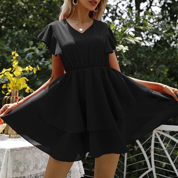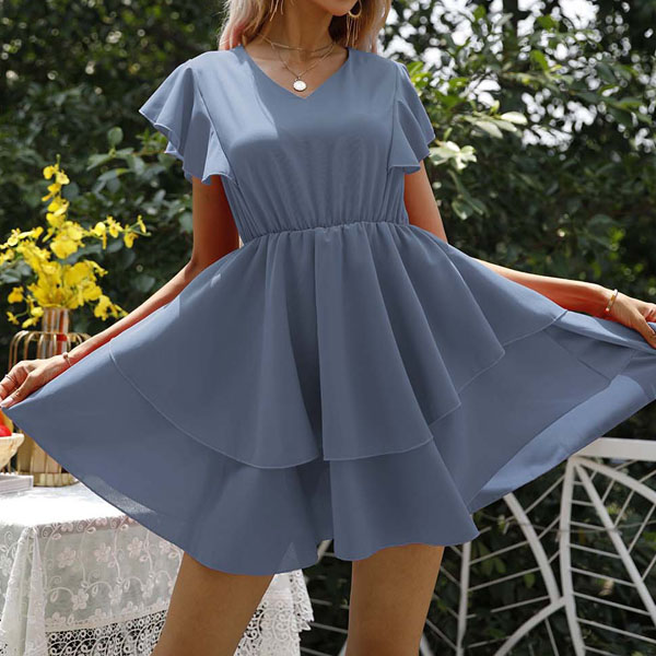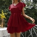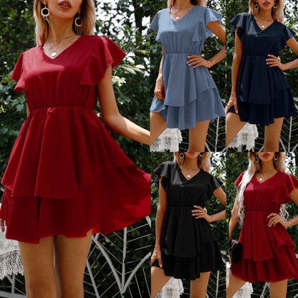 Elegant Solid Color Lotus Sleeve V-neck High Waist Cake Dress