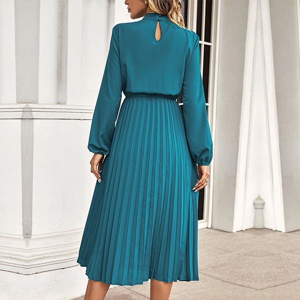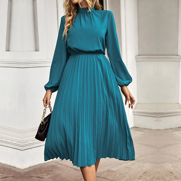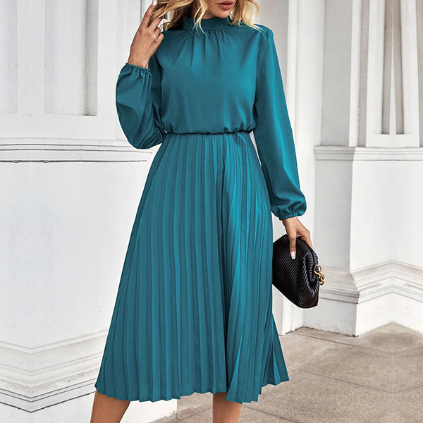 Elegant Solid Color Mock Neck Long Sleeve Cinch Waist Pleated Dress