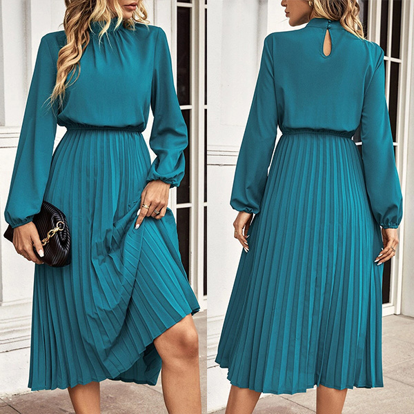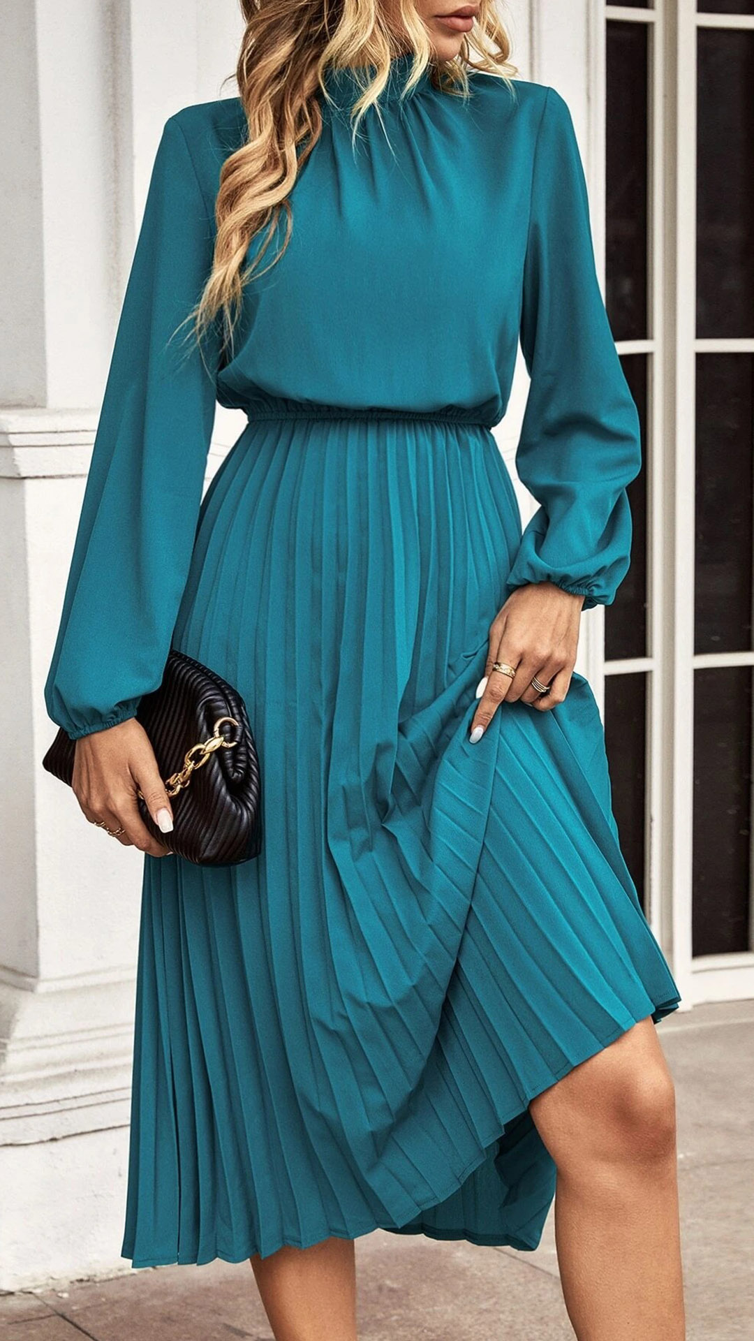 This dress exudes elegance and sophistication, making it a perfect choice for special occasions or formal events. The solid color design offers a timeless and classic look, while the mock neck and long sleeves add a modest and refined touch. The cinch waist detail creates a flattering silhouette, accentuating your curves in all the right places. The pleated skirt adds movement and grace to the dress, giving it a feminine and ethereal vibe. Is it your style?