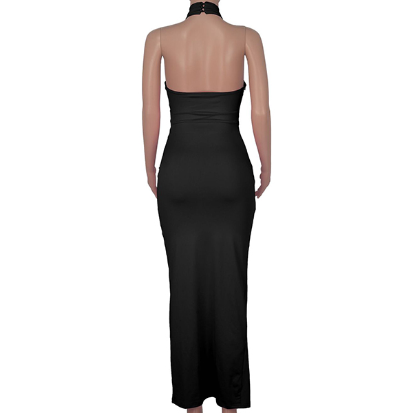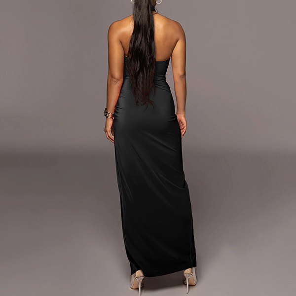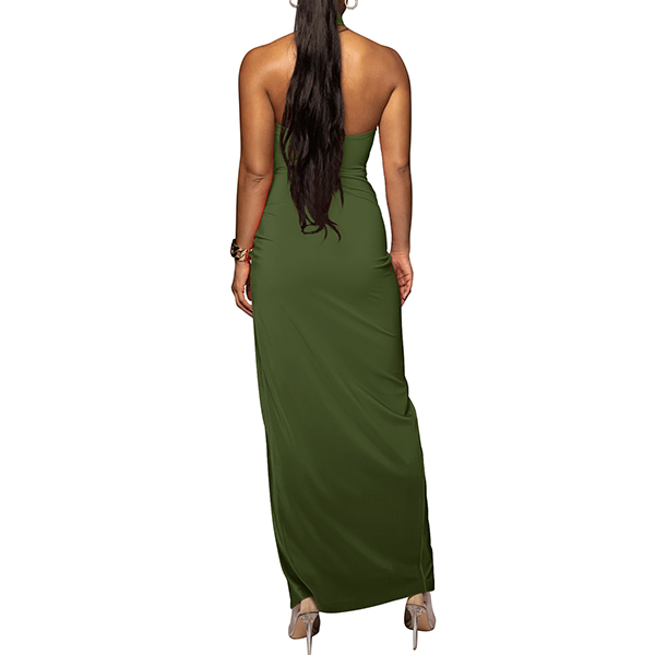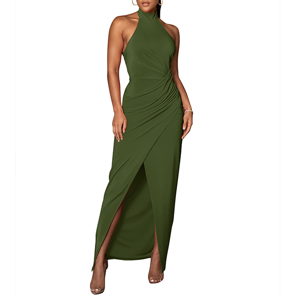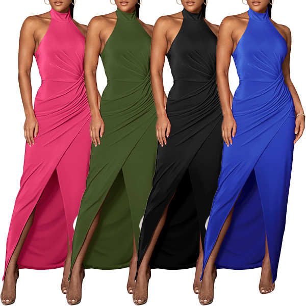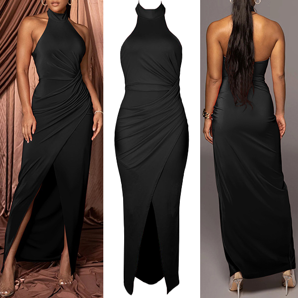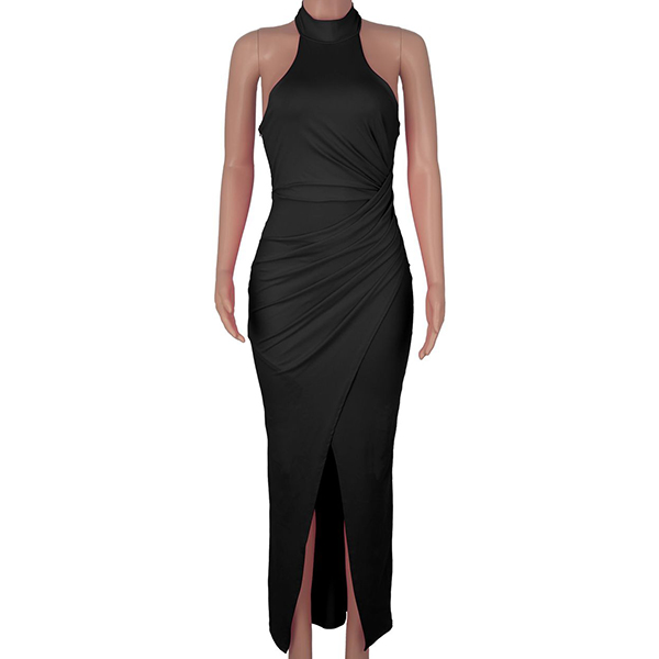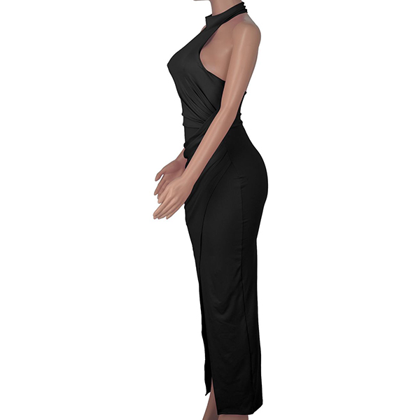 Elegant Solid Color Mock Neck Sleeveless Ruched Slit Bodycon Dress