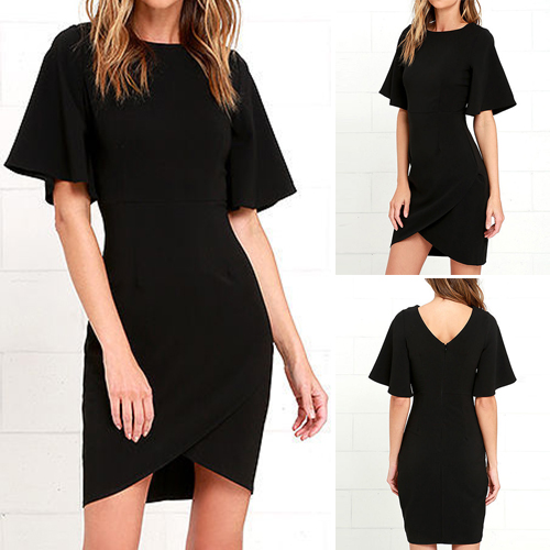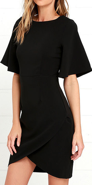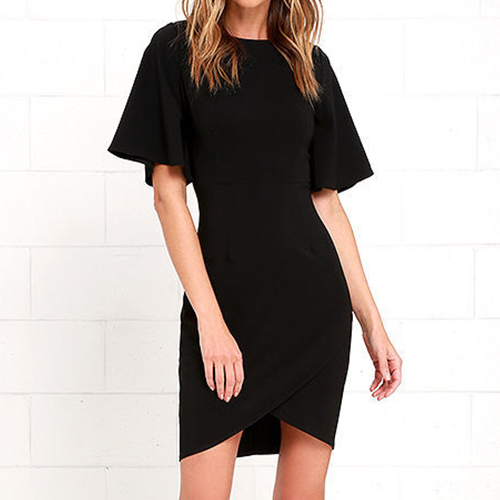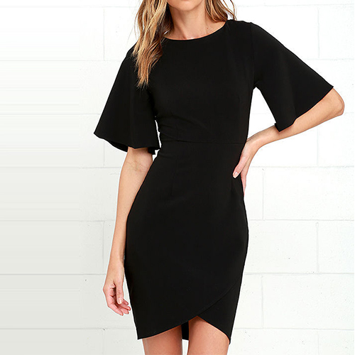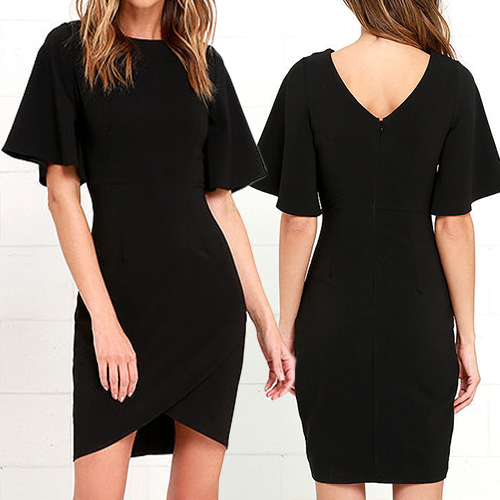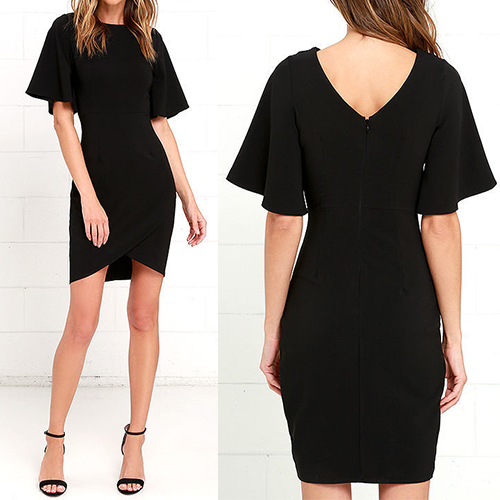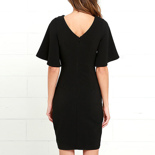 mysterious black hue, this dress boasts round neck, bell sleeve and v back design, the
