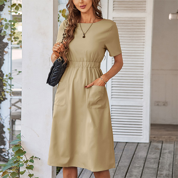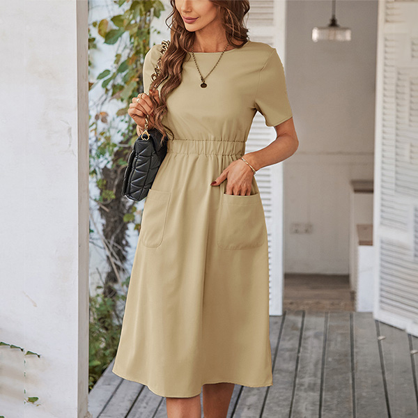 Elegant Solid Color Round Neck Buttoned Patch Pocket Dress