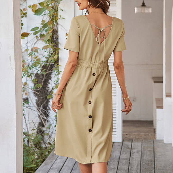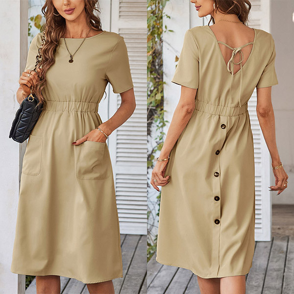 This elegant and stylish dress is perfect for any formal or casual occasion! It features a round neckline with back-tie details, front patch pocket for a casual look and back buttoned details at the skirt. Wanna have a try?