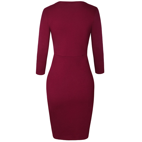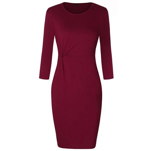 An elegant dress. The solid color and round neck make it versatile and easy to wear, while the ruched detail and bodycon fit give it a sexy and flattering look.