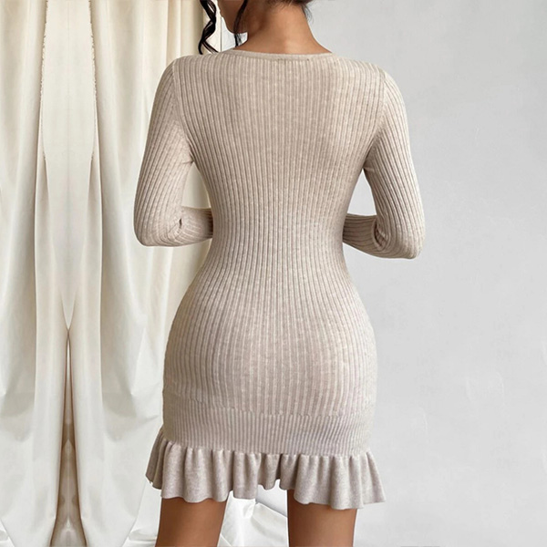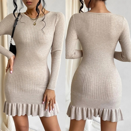 How about this ribbed dress? The round neckline adds a classic touch and flatters your neckline beautifully. The ruffled hemline ribbed detailing adds a playful and feminine element, creating a flattering and body-hugging silhouette. Made from high-quality fabric, this bodycon dress is not only fashionable but also comfortable and stretchy.
