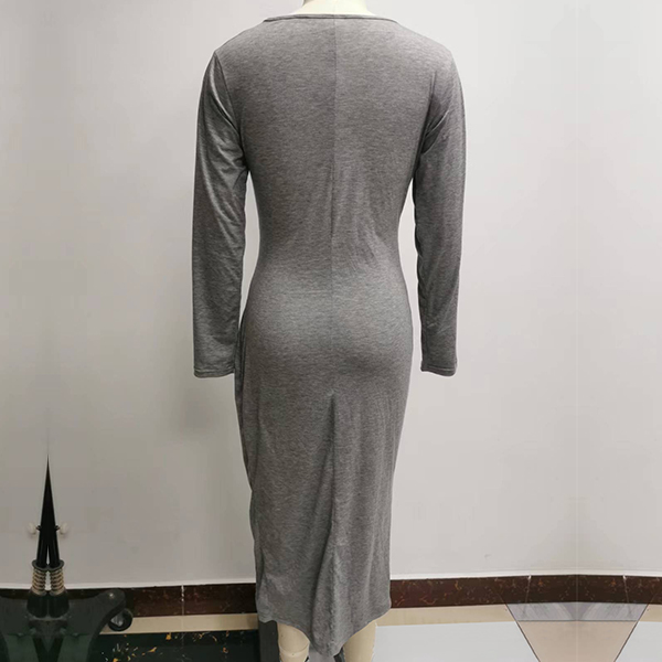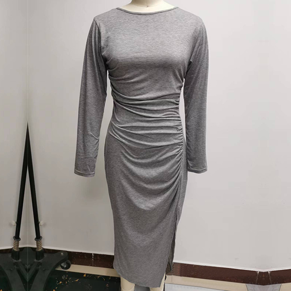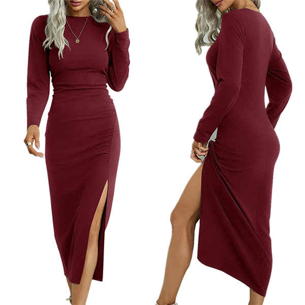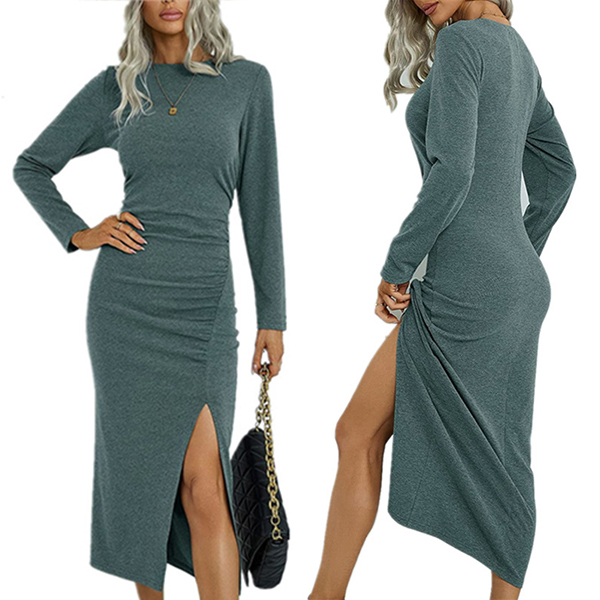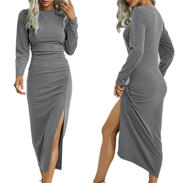 Elegant Solid Color Round Neck Long Sleeve Slit Bodycon Dress
