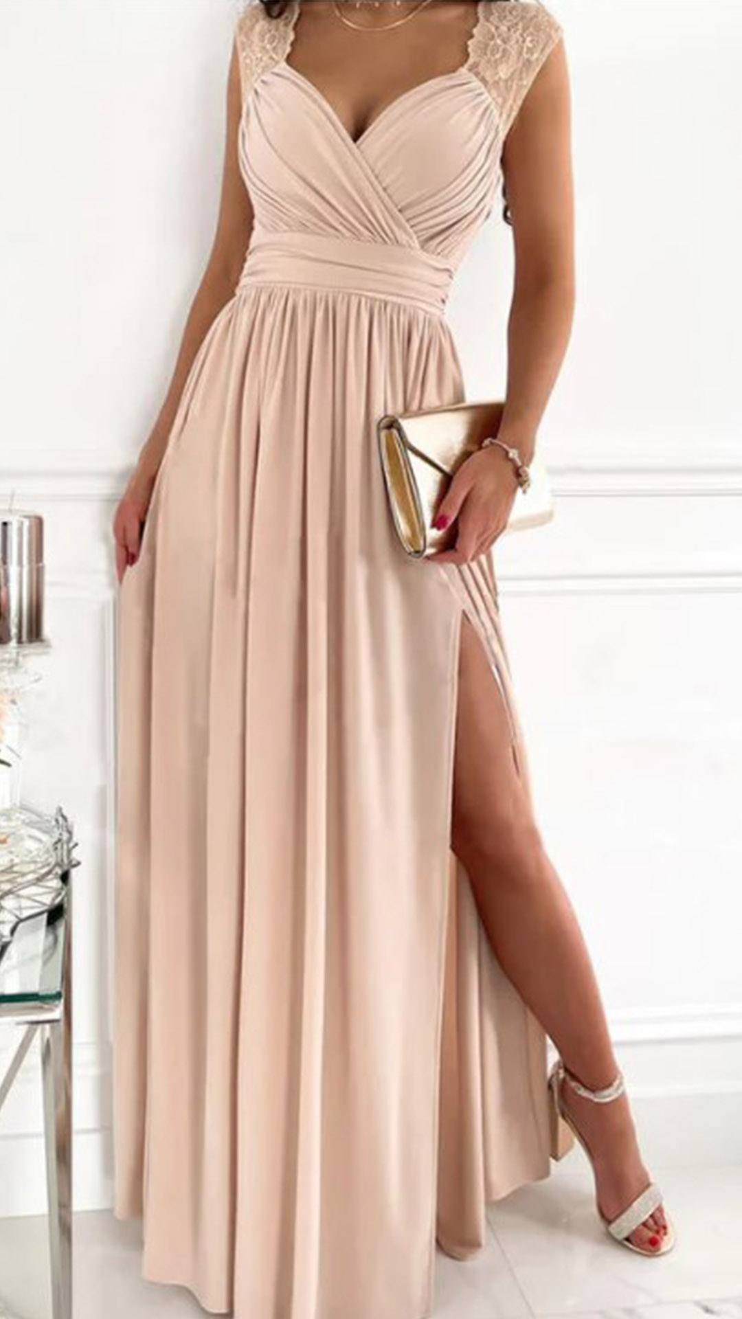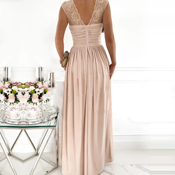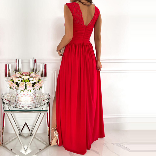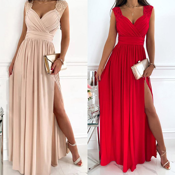 Looking for an elegant and sexy party dress? Look no further than this Gorgeous Dress! This dress features a V-neckline with lace spliced detail, high waist design with a slit at the skirt for a sexy look. It's perfect for any formal or special occasion!