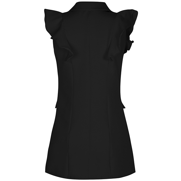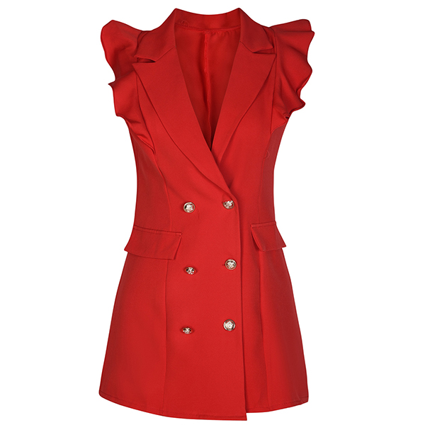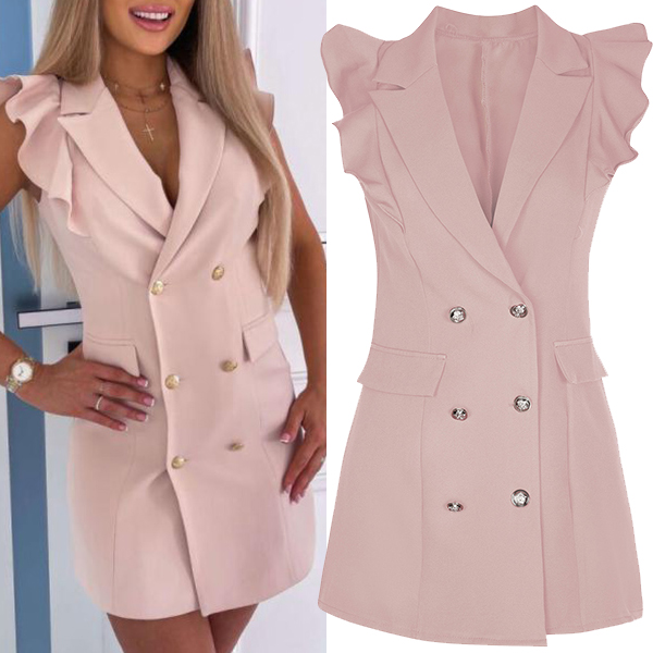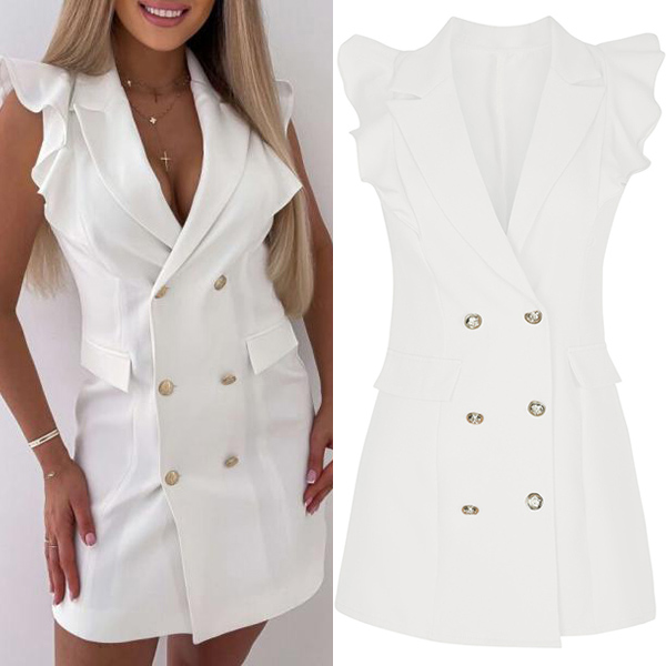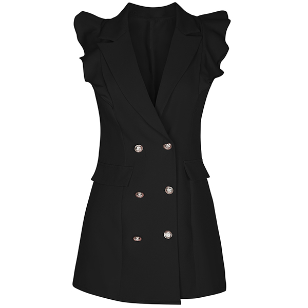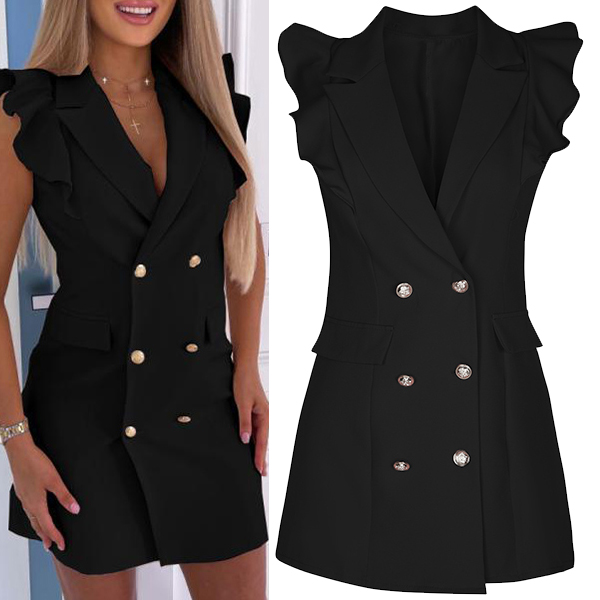 Elegant dress featuring solid color accent, classic lapel design, V-neck, sleeveless with ruffled details, double breast, and a short length. This elegant mini dress is perfect for any formal or semi-formal occasion.