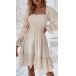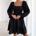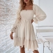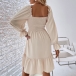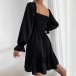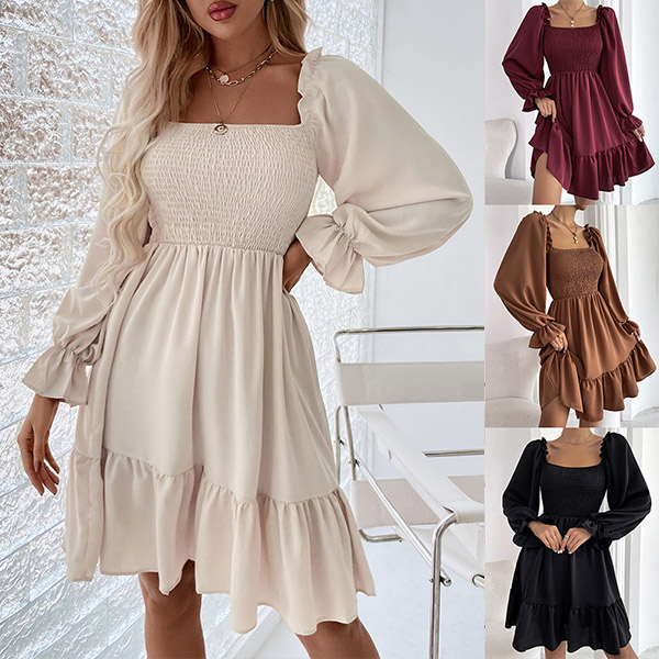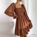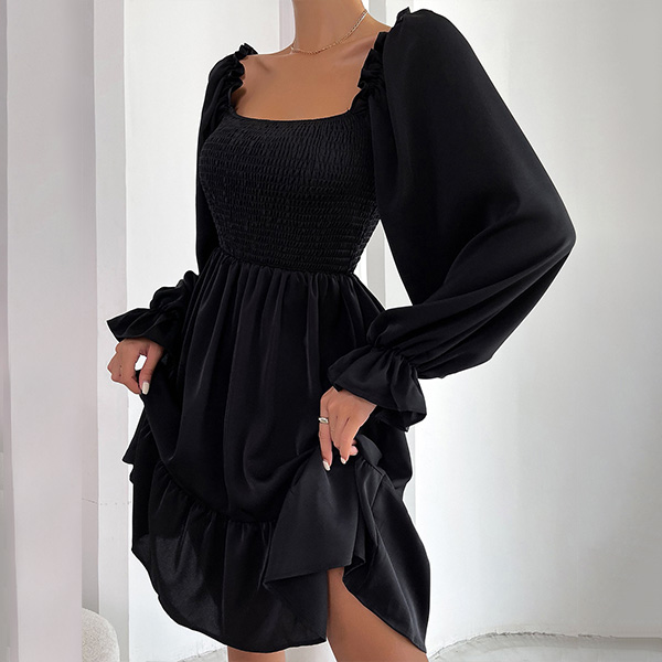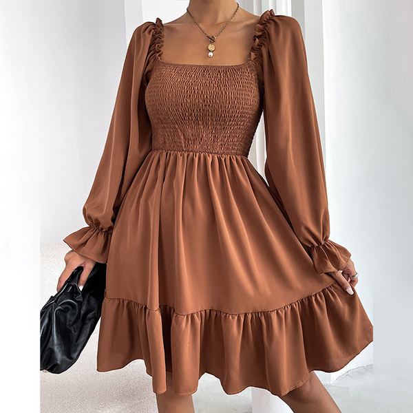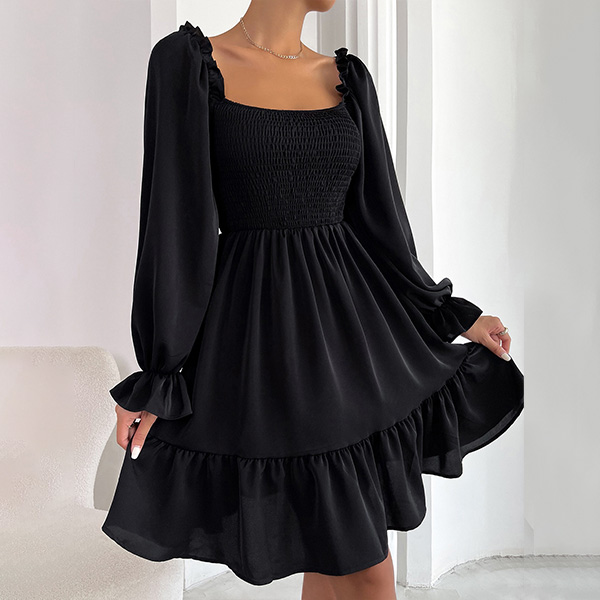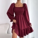 Elegant Solid Color Ruffled Square Neck Long Sleeve Smocked Tiered Dress