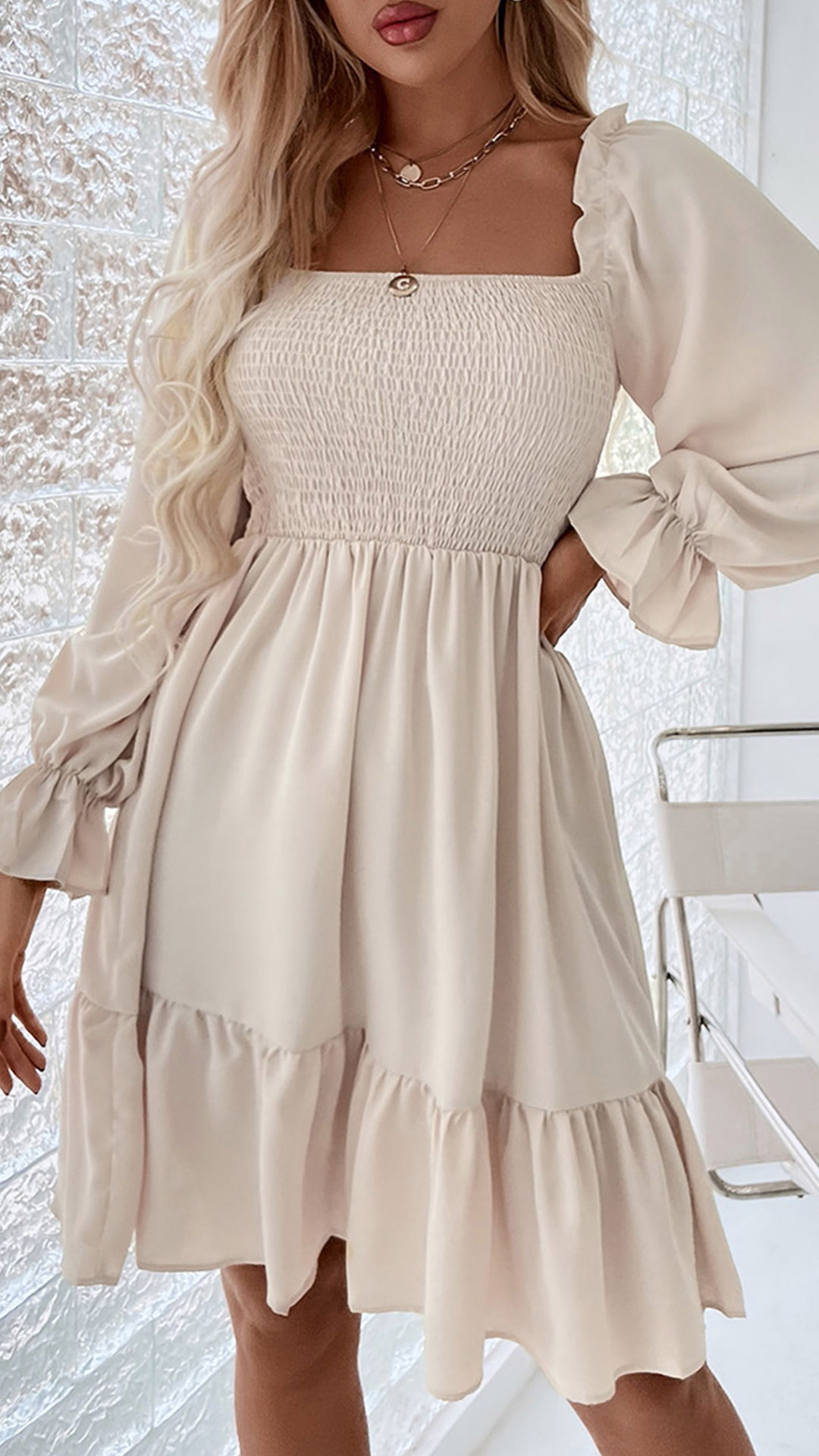 This mini dress features a square neckline, long sleeves, smocked detailing, and tiered skirt. This dress is perfect for any special occasion, from weddings to parties!