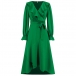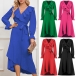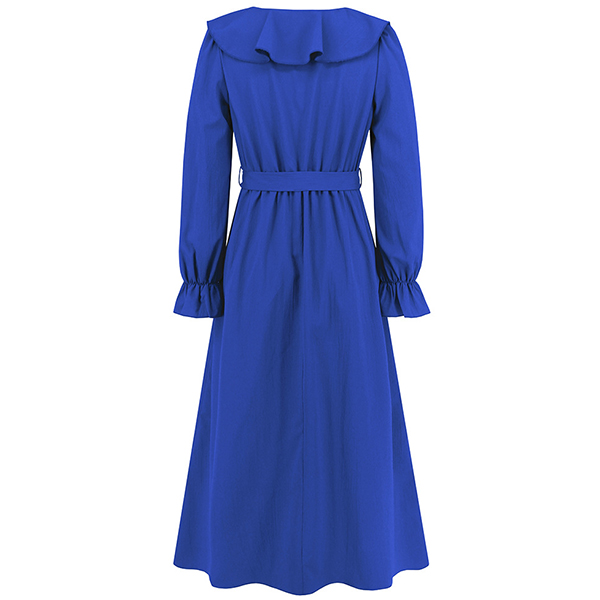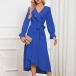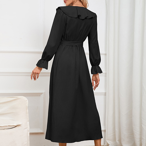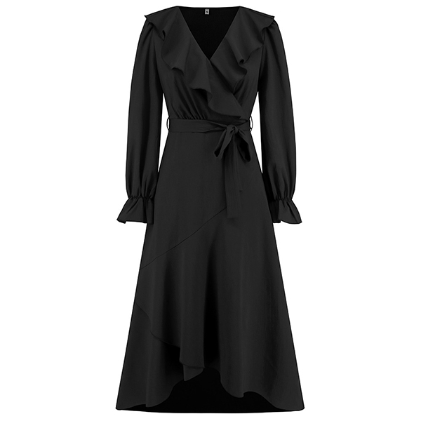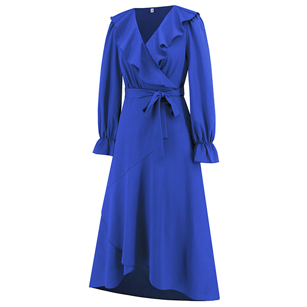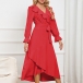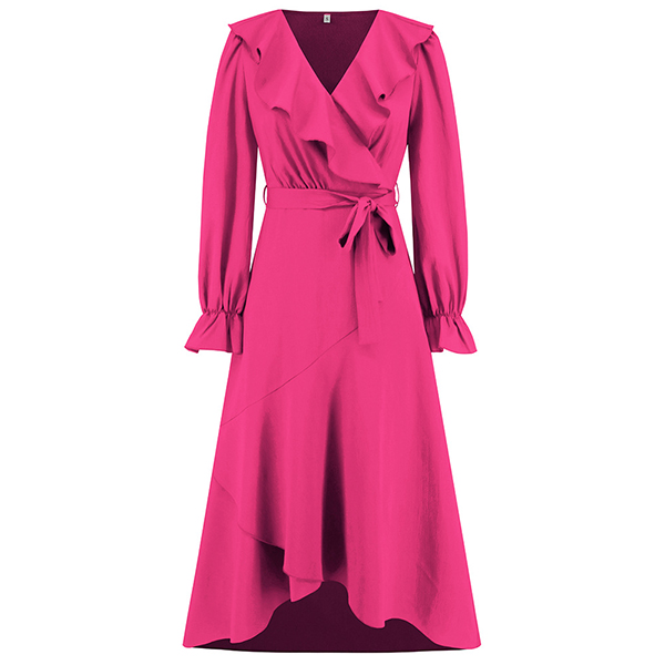 Elegant Solid Color Ruffled V-neck Long Sleeve Irregular Hemline Self-tie Midi Dress
