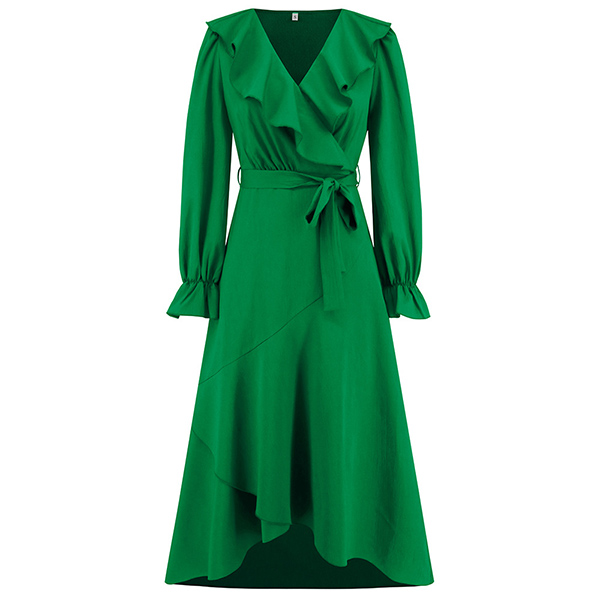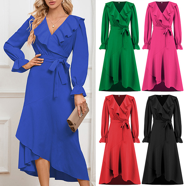 Look at this dress! The solid color design adds a timeless and versatile appeal, making it suitable for various occasions. The ruffled V-neckline adds a touch of elegance and adds a romantic flair to your look. The irregular hemline adds a unique and fashionable twist, and the self-tie waist belt allows you to cinch in the dress for a flattering and defined silhouette. Made from high-quality fabric, this midi dress offers both comfort and durability.