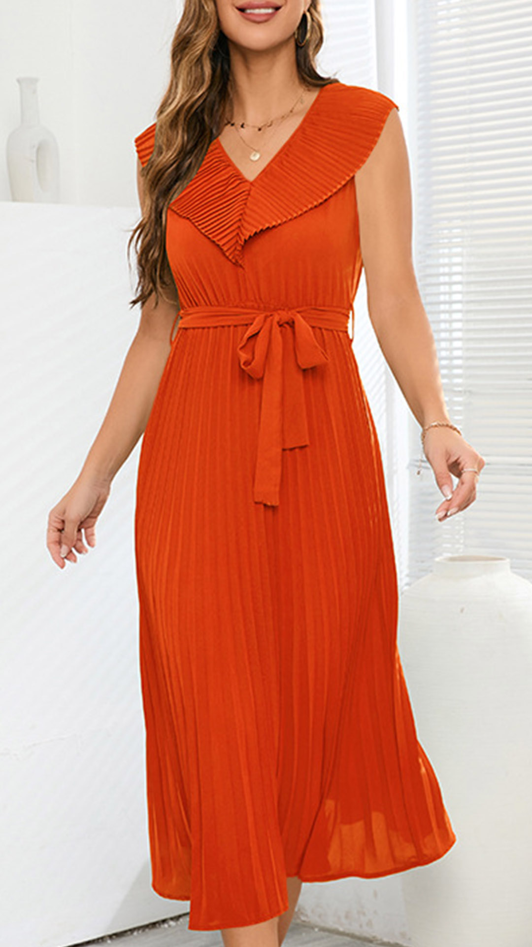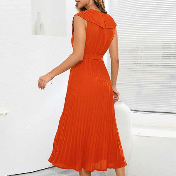 Elegant Solid Color Ruffled V-neck Sleeveless Self-tie Pleated Dress