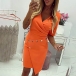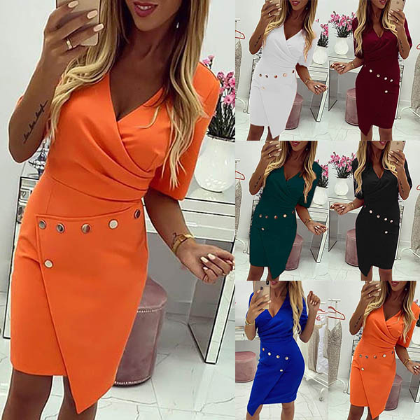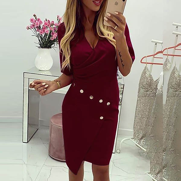 Elegant Solid Color Short Sleeve V-neck Irregular Hem Slim Fit Dress