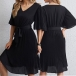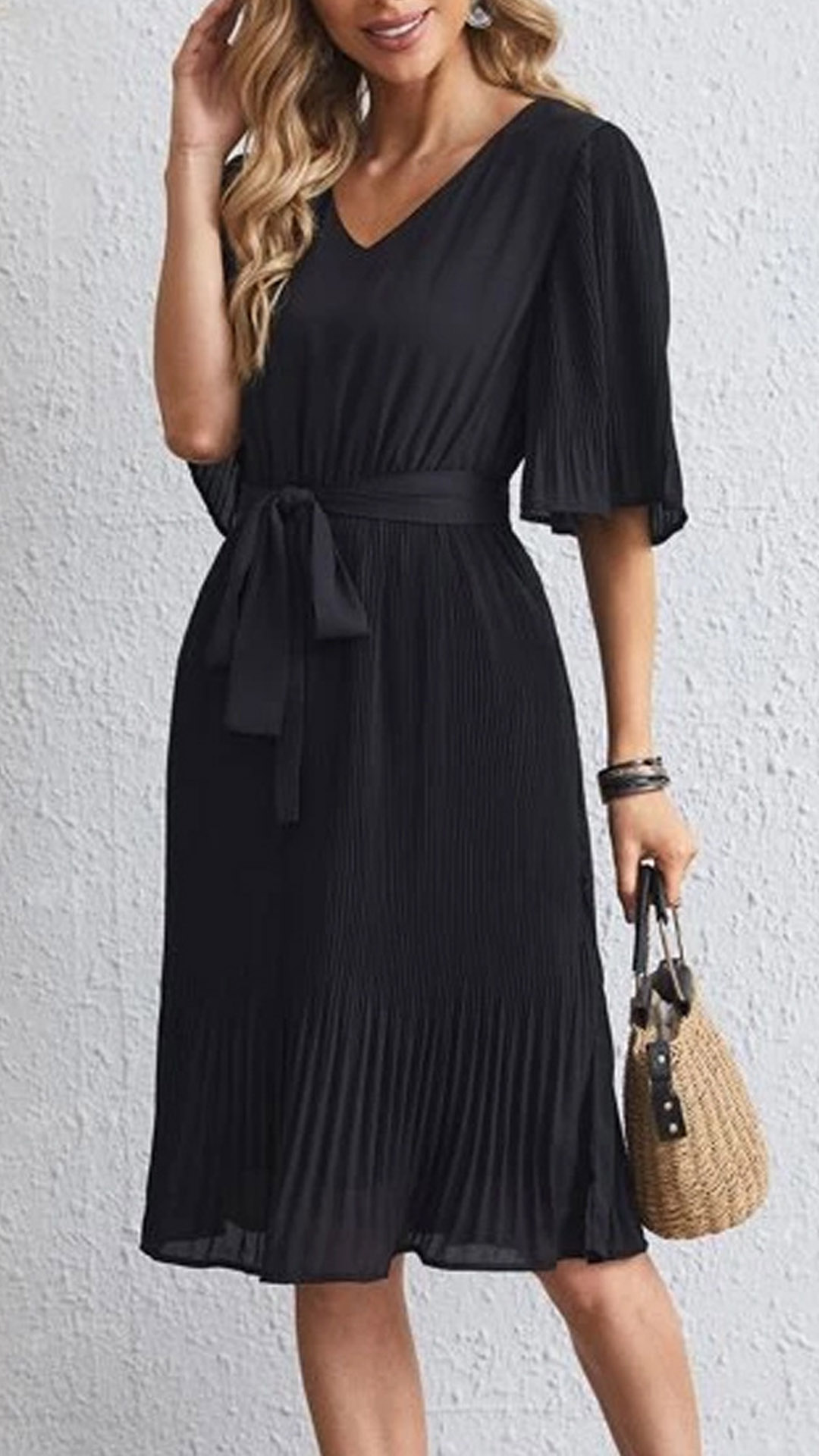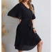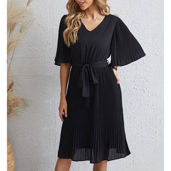 We know how rushed mornings can be - between packing lunches and going through a mental checklist, there's barely time to think about what you're going to wear for work! That's why we're loving this chiffon dress. The flattering black tone and lace-up design around the waist part can better showcase your slender figure. Finished with short sleeve and v-neck design,this dress is a good weapon to express your beauty and charm.