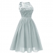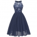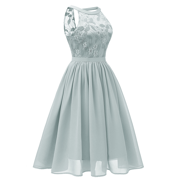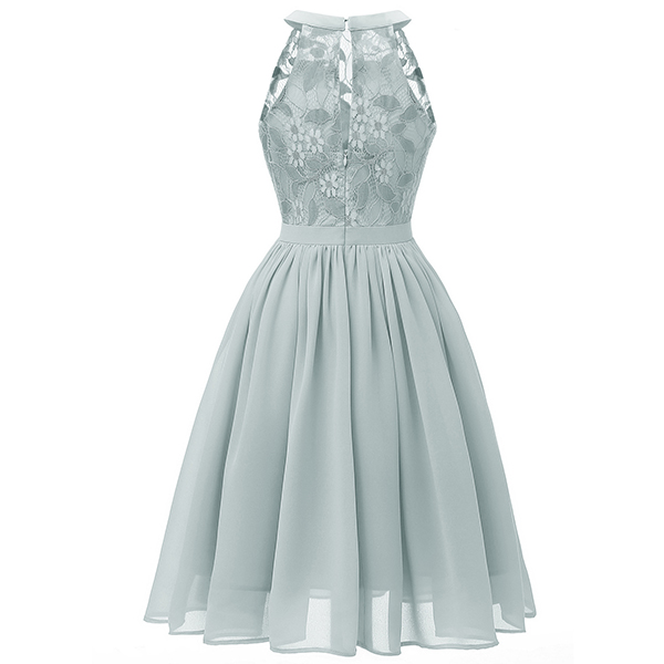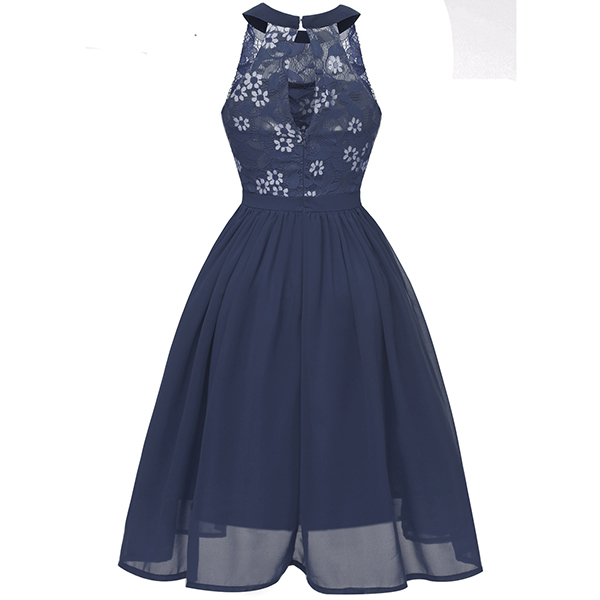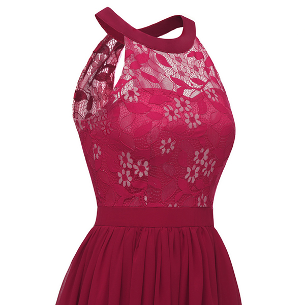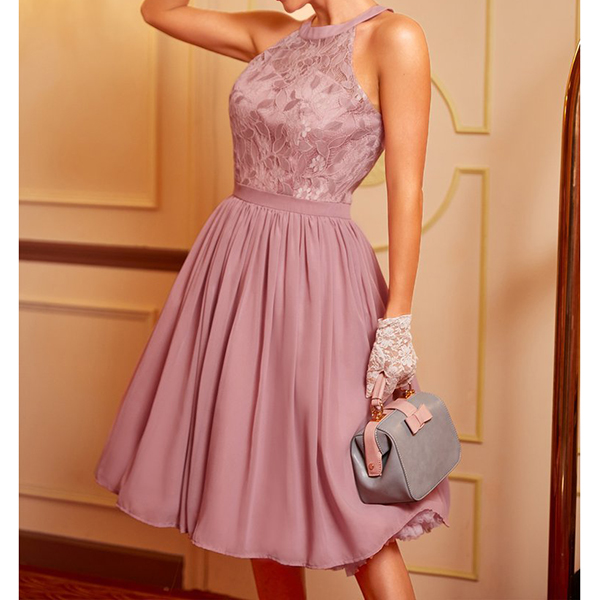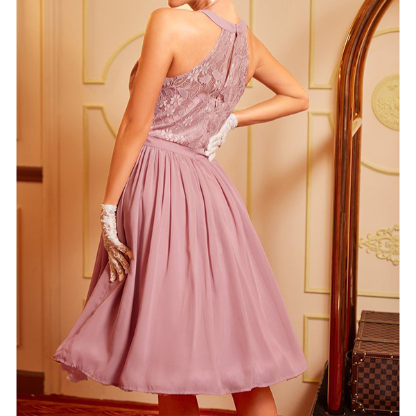 This is a beautiful and elegant mini dress that is perfect for any special occasion. The dress is made from a high quality and comfortable material, and it features a sleeveless design, a lace spliced bodice, and a pleated skirt. This dress is sure to make you look and feel your best.