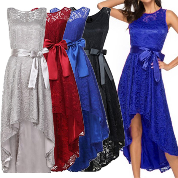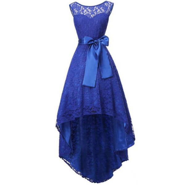 Elegant Solid Color Sleeveless Round Neck Bow-knot High Waist High-low Hem Lace Dress