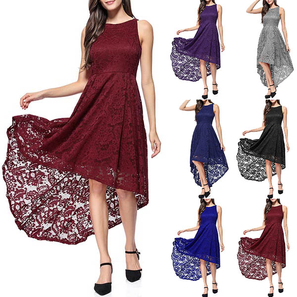 Elegant Solid Color Sleeveless Round Neck High-low Hem Lace Dress