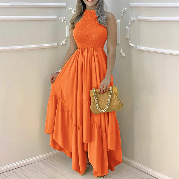 When invited to some fancy events,you can just slip into this dress to gain more eyes. Its bright color design makes it look so eye-catching. Finished with sleeveless,round neck,high waist and an irregular hem,this dress knows how to express your charm and style. And the wrinkled details will further enhance its entire charm. Like it? Then buy one!