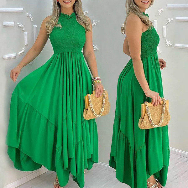 Elegant Solid Color Sleeveless Round Neck High Waist Irregular Hem Wrinkled Dress