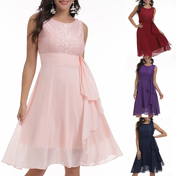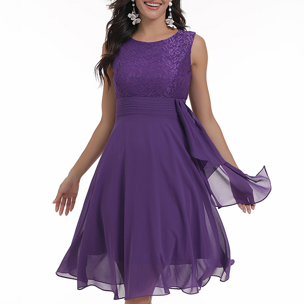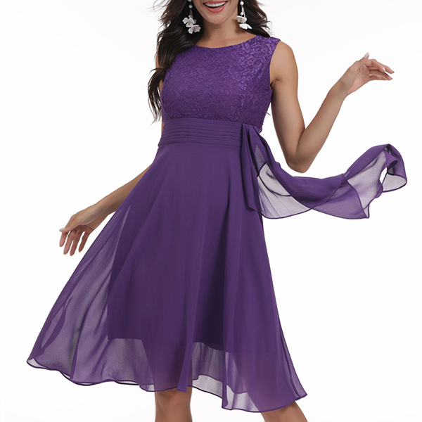 It is an easy thing to portray your elegant and charming image through this delicate chiffon dress. The lace spliced details can easily enhance your feminine appeal. Finished with sleeveless,round neck and high waist design,this dress also can showcase your slender figure. This is a dress which can be fit for different occasions. So why not invite this piece to your wardrobe?